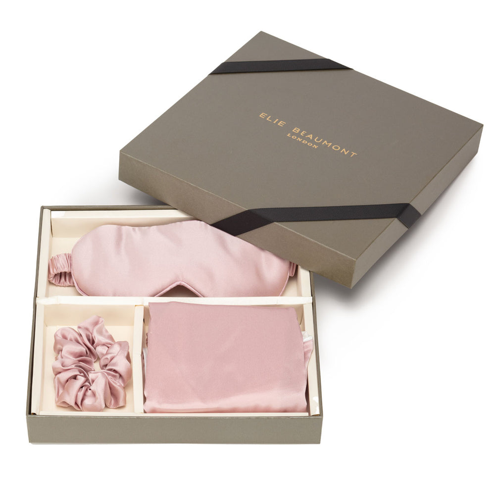 Our 19 momme premium pure silk gift set is presented in its Elie Beaumont elite grey gift box.